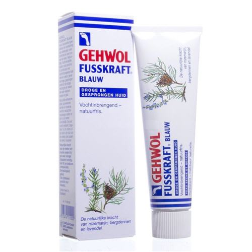 Gehwol Fusskraft Blauw is een rijke crème voor de verzorging van droge, ruwe en gesprongen voeten. De formule bevat intensief hydraterende ingrediënten zoals ureum en aloë vera, samen met natuurlijke oliën van rozemarijn, bergden en lavendel. Deze bestanddelen verzachten de huid, verbeteren de doorbloeding en maken de voeten soepel en glad.